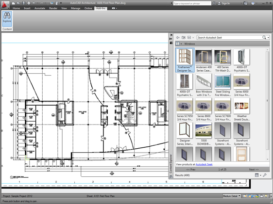 Βρείτε γρήγορα αρχεία σχεδίων, ή συγκεκριμένα αντικείμενα που μπορεί να περιέχονται μέσα σε αυτό, με το νέο πάνελ αναζήτησης, που σας επιτρέπει να πραγματοποιείτε άμεσες και γρήγορες αναζητήσεις στα τρέχοντα σχέδια, στο Autodesk® Seek® web service, στον τοπικό σας δίσκο, και το τοπικό σας δίκτυο, μέσα από το περιβάλλον του AutoCAD Architecture.